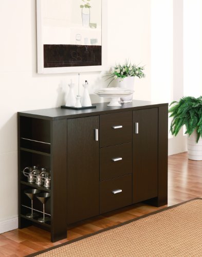 Enitial Lab Quincy Dining Buffet/Server, Cappuccino. A stylish alternative to built-in cabinetry, the Quincy Dining Buffet/Server organizes, stores and displays your entertaining essentials. With room to store an ample wine glass holder, this buffet is ideal for entertaining. Behind its cabinet doors, you'll find two shelves separating three storage compartments on each side of buffet.